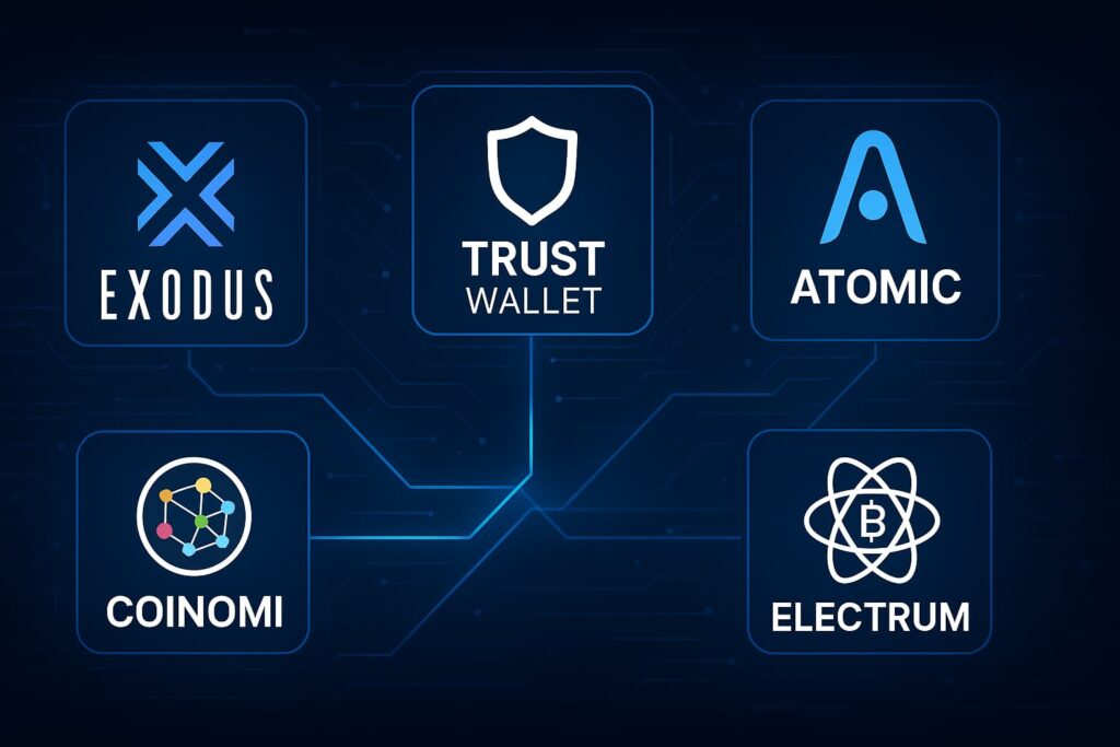 Ledger, Trezor, Trust Wallet, Exodus, Atomic, Coinomi, MetaMask, Electrum, Guarda, and Mycelium.